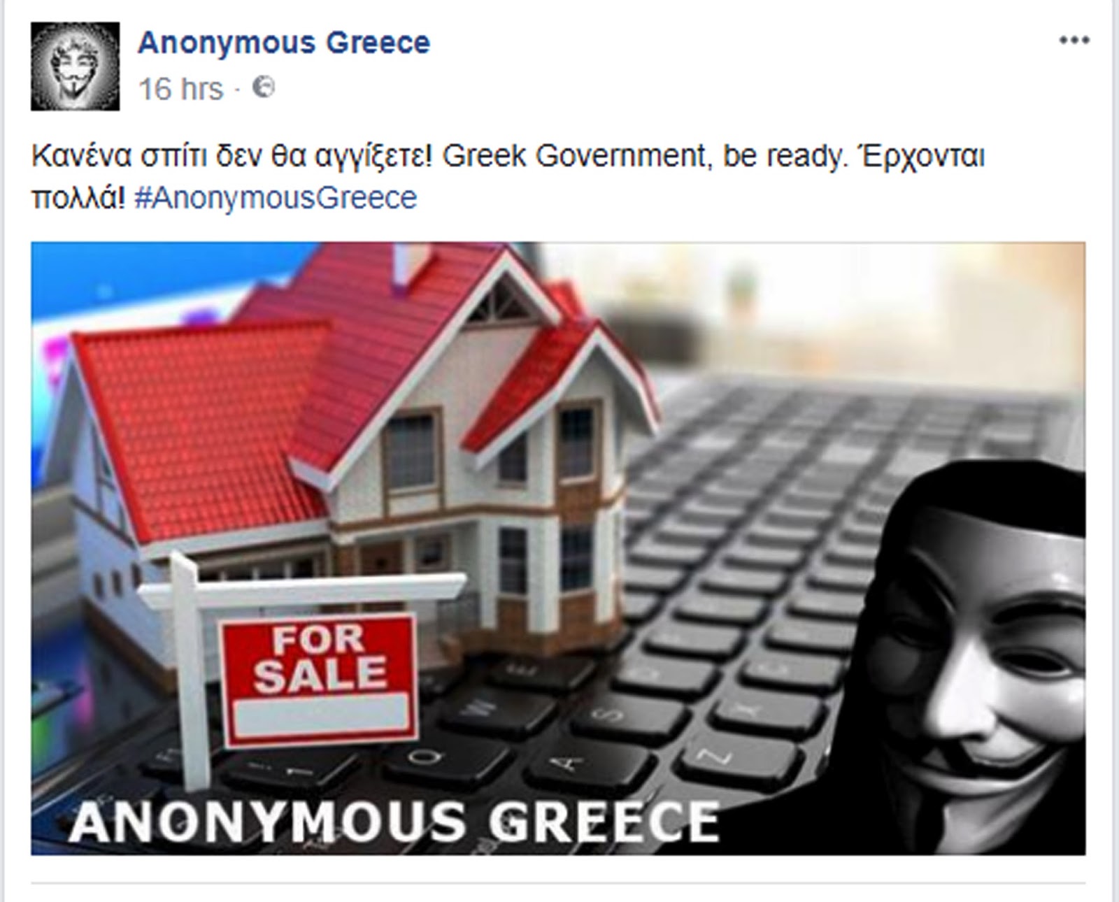 Στο μήνυμά τους οι Anonymous Greece προειδοποιούν την ελληνική κυβέρνηση για τους ηλεκτρονικούς πλειστηριασμούς και τη χαρακτηρίζουν αρπακτικά.