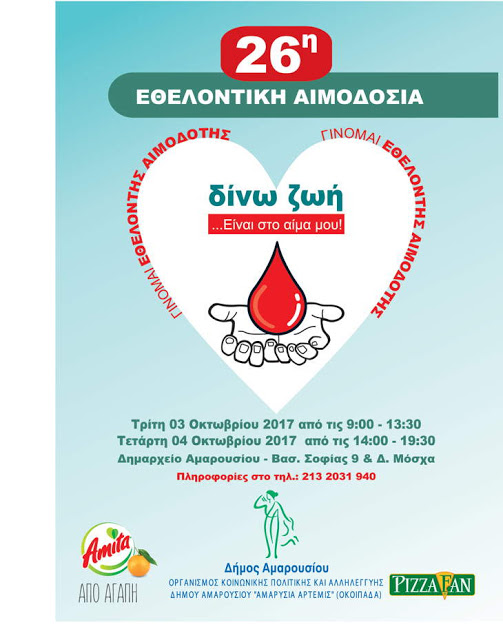 «Στις 3 & 4 Οκτωβρίου 2017 ο Δήμος Αμαρουσίου διοργανώνει την 26η Εθελοντική Αιμοδοσία. Κάθε εθελοντής αιμοδότης είναι πολύτιμος. Κάθε φιάλη αίματος είναι πολύτιμη. Το αποδεικνύει η δραματική ζήτηση σε ποσότητες αίματος μέσα από τα αιτήματα που φτάνουν καθημερινά στην Τράπεζα Αίματος του Δήμου μας. Είναι ανάγκη ο καθένας από εμάς να αντιληφθεί τη σημασία της προσφοράς αίματος, τη σπουδαιότητα της προσφοράς ζωής.