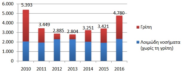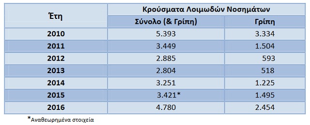 Κρούσματα γρίπης και λοιπών λοιμωδών νοσημάτων, 2010-2016