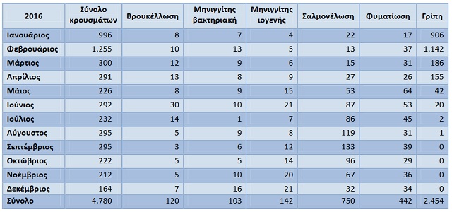 Κρούσματα των πέντε συχνότερων λοιμωδών νοσημάτων και της γρίπης κατά μήνα, έτος 2016