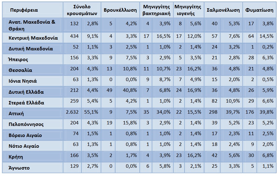 Σχετικά με τη γεωγραφική κατανομή των παραπάνω πέντε λοιμωδών νοσημάτων, από τα στοιχεία του 2016 παρατηρείται ότι τα περισσότερα κρούσματα σαλμονέλωσηςκαταγράφηκαν στην περιφέρεια της Αττικής (39,7%) και στην περιφέρεια της Στερεάς Ελλάδας (10,9%). Η φυματίωση παρουσιάζει ένα σημαντικό ποσοστό κρουσμάτων στην περιφέρεια της Αττικής (39,8%) και της Κεντρικής Μακεδονίας (14,5%). Όσον αφορά την ιογενή μηνιγγίτιδα, τα περισσότερα κρούσματα εμφανίζονται στην περιφέρεια της Δυτικής Ελλάδας (16,9%), της Θεσσαλίας και της Κρήτης (16,2%) και η βακτηριακή μηνιγγίτιδα στην περιφέρεια της Αττικής (34%) και της Κεντρικής Μακεδονίας (16,5%). Τέλος, στις περιφέρειες της Δυτικής Ελλάδας και της Πελοποννήσου παρουσιάζονται τα μεγαλύτερα ποσοστά κρουσμάτων βρουκέλλωσης, σε ποσοστό 40,8% και 15,8% αντίστοιχα.