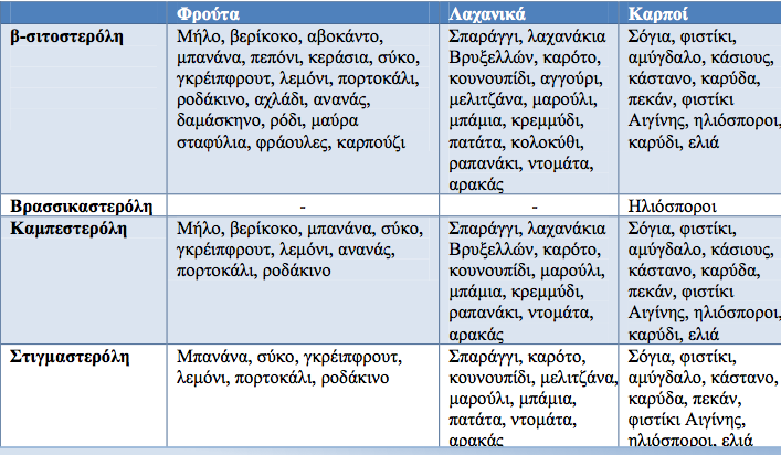 Οι φυτικές στερόλες- στανόλες περιέχονται σε “Φυσικά τρόφιμα”, όπως φρούτα (μήλο, μπανάνα, κεράσια, σύκο, πορτοκάλι, γκρέιπφρουτ), λαχανικά (ντομάτα, αγκινάρα), όσπρια, ξηρούς καρπούς (φιστίκια, κάσιους, ηλιόσπορος), αβοκάντο και σόγια αλλά και σε “εμπλουτισμένα λειτουργικά τρόφιμα” όπως είναι οι μαργαρίνες, τα γαλακτοκομικά (γάλα, γιαούρτι, ρόφημα γιαουρτιού) και τα δημητριακά.