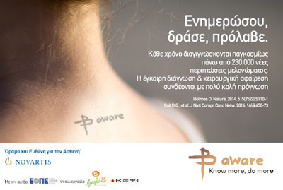 Η καμπάνια Melanoma B aware Greece αποτελεί μια πρωτοβουλία του τμήματος Oγκολογίας της εταιρείας Novartis, υπό την αιγίδα της Εταιρείας Ογκολόγων Παθολόγων Ελλάδος και με την υποστήριξη του Συλλόγου «ΑγκαλιάΖΩ» και του Συλλόγου Καρκινοπαθών – Εθελοντών – Φίλων – Ιατρών «Κ.Ε.Φ.Ι.» Αθηνών.