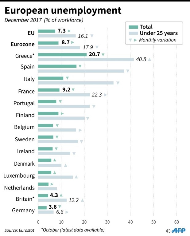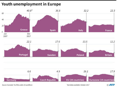 Η Ελλάδα και η Ισπανία είναι οι δύο χώρες που επηρεάζονται περισσότερο από την ανεργία των νέων. «Δεν αποτελεί έκπληξη, καθώς τα χρόνια της ύφεσης και των πολιτικών λιτότητας άνευ προηγουμένου υπήρξαν ιδιαίτερα σκληρά», σχολιάζει το AFP σε σχετικό δημοσίευμα.