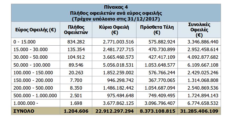 Μεγάλο μέρος του υπολοίπου οφειλών αφορά 89.546 οφειλέτες που έχουν οφειλή από 50.000- 100.000 ευρώ (περίπου 20% του τρέχοντος υπολοίπου)