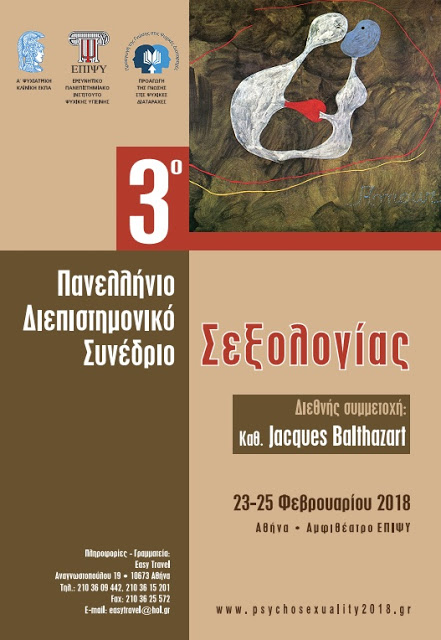 Από 23 έως 25 Φεβρουαρίου, θα διεξαχθεί στην Αθήνα, στις εγκαταστάσεις του Ερευνητικού Πανεπιστημιακού Ινστιτούτου Ψυχικής Υγιεινής, (Σωρανού του Εφεσίου 2) το 3ο Πανελλήνιο Διεπιστημονικό Συνέδριο Σεξολογίας.