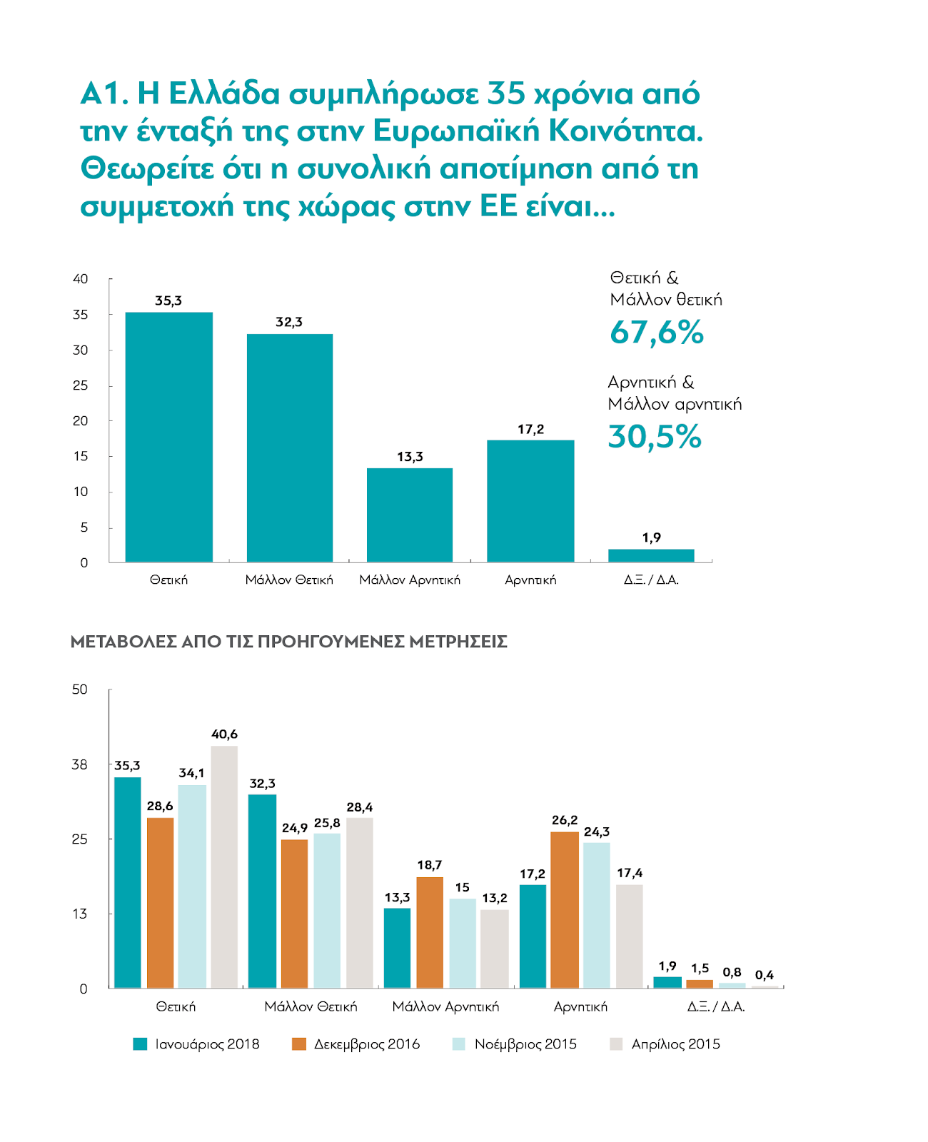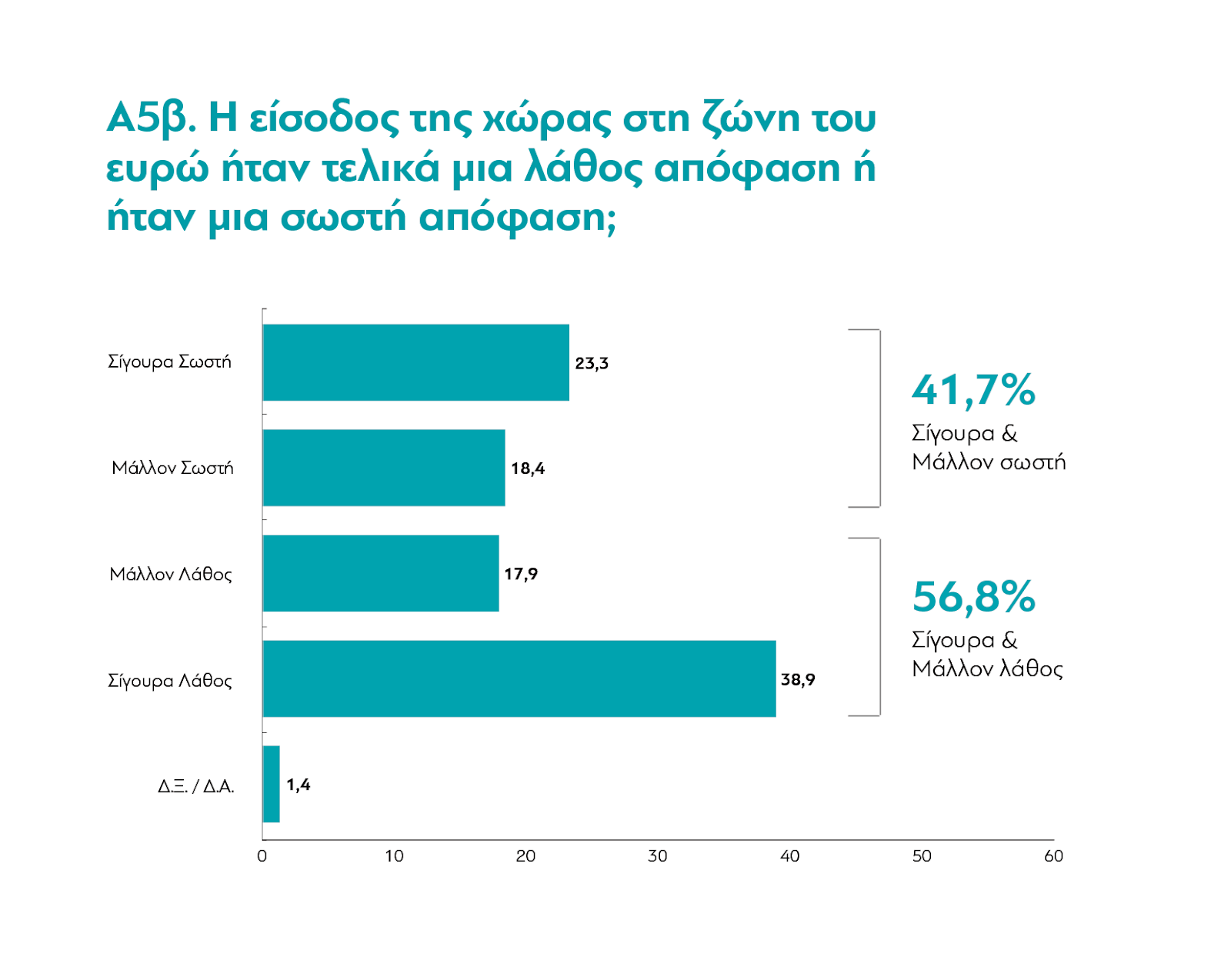 – το 57% των Ελλήνων θεωρεί λανθασμένη την απόφαση ένταξης της Ελλάδας στη ζώνη του ευρώ, αλλά το 66% θεωρεί καλύτερη την παραμονή στο ευρώ, έναντι της επιστροφής στη Δραχμή.