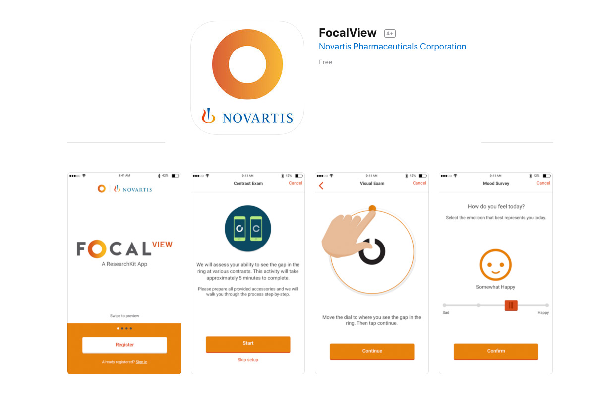 Νovartis ανακοίνωσε το λανσάρισμα της εφαρμογής FocalView, μιας πλατφόρμας ψηφιακής έρευνας στον τομέα της οφθαλμολογίας, η οποία δημιουργήθηκε με το ResearchKit. Το FocalView έχει ως στόχο να επιτρέπει στους ερευνητές να παρακολουθούν την εξέλιξη της νόσου με τη συλλογή αυτοαναφερόμενων δεδομένων σε πραγματικό χρόνο, απευθείας από τους συναινούντες ασθενείς. Προσαρμόζοντας τον σχεδιασμό των κλινικών δοκιμών για να ταιριάζει στο καθημερινό πρόγραμμα των ασθενών, η εφαρμογή μπορεί να μειώσει τους περιορισμούς συμμετοχής, οδηγώντας σε πιο διεξοδική κατανόηση των οφθαλμικών παθήσεων και εν δυνάμει την ανάπτυξη καινοτόμων θεραπειών.