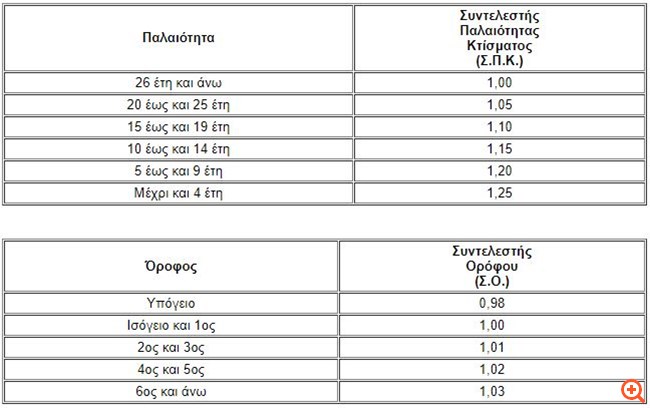 Στο ποσό που προκύπτει με βάση την κλίμακα του κύριου φόρου εφαρμόζονται συντελεστές παλαιότητας και ορόφου ως εξής: