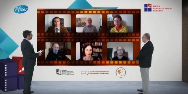 Τα βραβεία στην εκδήλωση, η οποία λόγω των περιοριστικών μέτρων για την πρόληψη της νόσου COVID-19 έγινε διαδικτυακά, απένειμαν ο κ. Αλέξανδρος Κακαβάς, Πρόεδρος της Ένωσης Σεναριογράφων Ελλάδος και ο κ. Βασίλης Τζινιέρης, Hospital Business Unit Lead Greece Region της Pfizer Hellas.