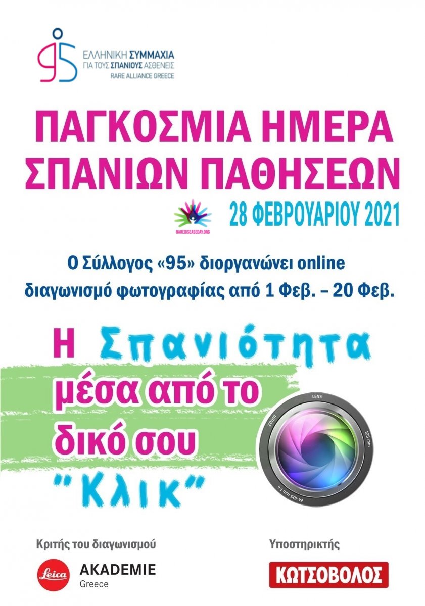 Φέτος, για πρώτη χρονιά, ο Σύλλογος «95», με αφορμή τον εορτασμό της Παγκόσμιας Ημέρας Σπάνιων Παθήσεων στις 28 Φεβρουαρίου, διοργανώνει on–line Διαγωνισμό Φωτογραφίας, από την 1η έως και τις 20 Φεβρουαρίου 2021, με την ευγενική υποστήριξη της Leica Academy (Ακαδημία Δημιουργικής Φωτογραφίας), η οποία θα αναλάβει, σε συνεργασία με τον Σύλλογο «95», το έργο της αξιολόγησης των φωτογραφιών. Μαζί θα αποτελέσουν την Κριτική Επιτροπή του Διαγωνισμού.
