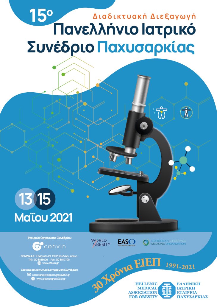 Η Ελληνική Ιατρική Εταιρεία Παχυσαρκίας (Ε.Ι.Ε.Π.) διοργανώνει το 15ο Πανελλήνιο Συνέδριο Παχυσαρκίας, στις 13-15 Μαΐου 2021, για πρώτη φορά διαδικτυακά. Το συνέδριο, που αποτελεί εδώ χρόνια θεσμό της επιστημονικής και εκπαιδευτικής δραστηριότητας της Εταιρείας, συμπίπτει φέτος με τη συμπλήρωση των 30 χρόνων από την ίδρυση της.