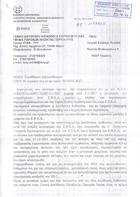 Με μια επιστολή, ο ΕΦΚΑ απάντησε στον Ιατρικό Σύλλογο Πειραιά ότι οι ληξιπρόθεσμες οφειλές δεν εξοφλούνται γιατί δεν έχουν… μελάνι και σχετικές οδηγίες.