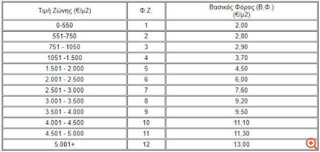 Ο κύριος φόρος υπολογίζεται με συντελεστή ευρώ ανά τετραγωνικό κτίσματος με βάση την παρακάτω κλίμακα: