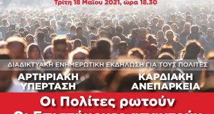 Συνεργασία Ελληνικής Καρδιολογικής Εταιρείας και Ένωσης Ασθενών Ελλάδας σε Διαδικτυακή Εκδήλωση Ενημέρωσης Κοινού για την Καρδιακή Ανεπάρκεια και την Αρτηριακή Υπέρταση Η Ελληνική Καρδιολογική Εταιρεία σε συνεργασία με την Ένωση Ασθενών Ελλάδας πραγματοποιούν την Τρίτη 18 Μαΐου 2021 και ώρα 18.30 διαδικτυακή ενημερωτική εκδήλωση με θέμα «Καρδιακή Ανεπάρκεια και Αρτηριακή …