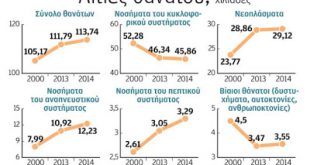 Αύξηση των θανάτων από καρκίνο, αναπνευστικά νοσήματα και ψυχικές-νευρολογικές διαταραχές και, παράλληλα, μείωση των θανάτων από εμφράγματα και εγκεφαλικά, που ωστόσο παραμένουν η πρώτη αιτία θανάτου, καταγράφηκε το 2014 στη χώρα μας. Συνολικά ο αριθμός των θανάτων στην Ελλάδα το 2014 αυξήθηκε οριακά σε σύγκριση με το 2013, κατά 1,7%. …
