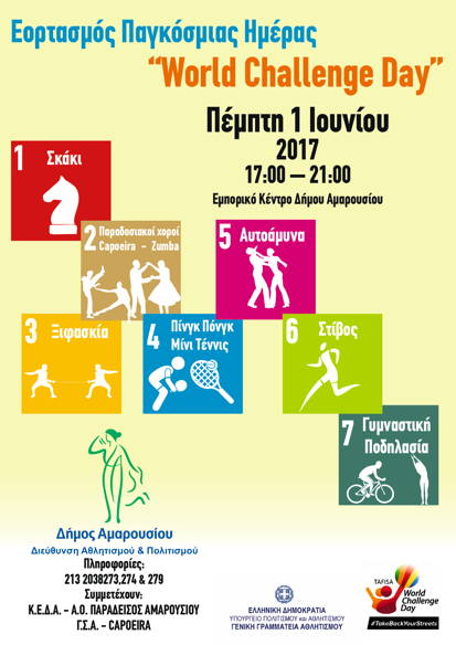 Με σκάκι, παραδοσιακούς χορούς, γυμναστική, ξιφασκία, πινγκ πονγκ, μίνι τένις, αυτοάμυνα, όργανα γυμναστικής Πέμπτη 1 Ιουνίου 2017, 17:00 -21:00 Στον…